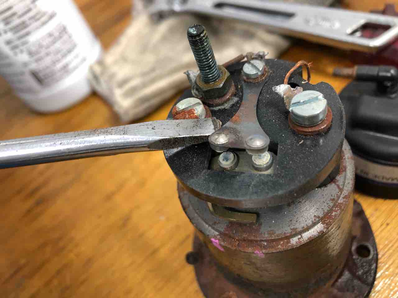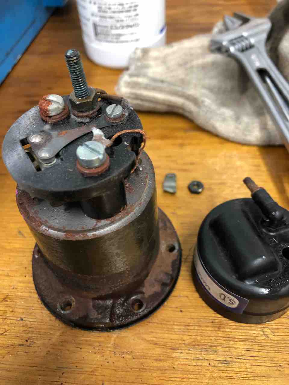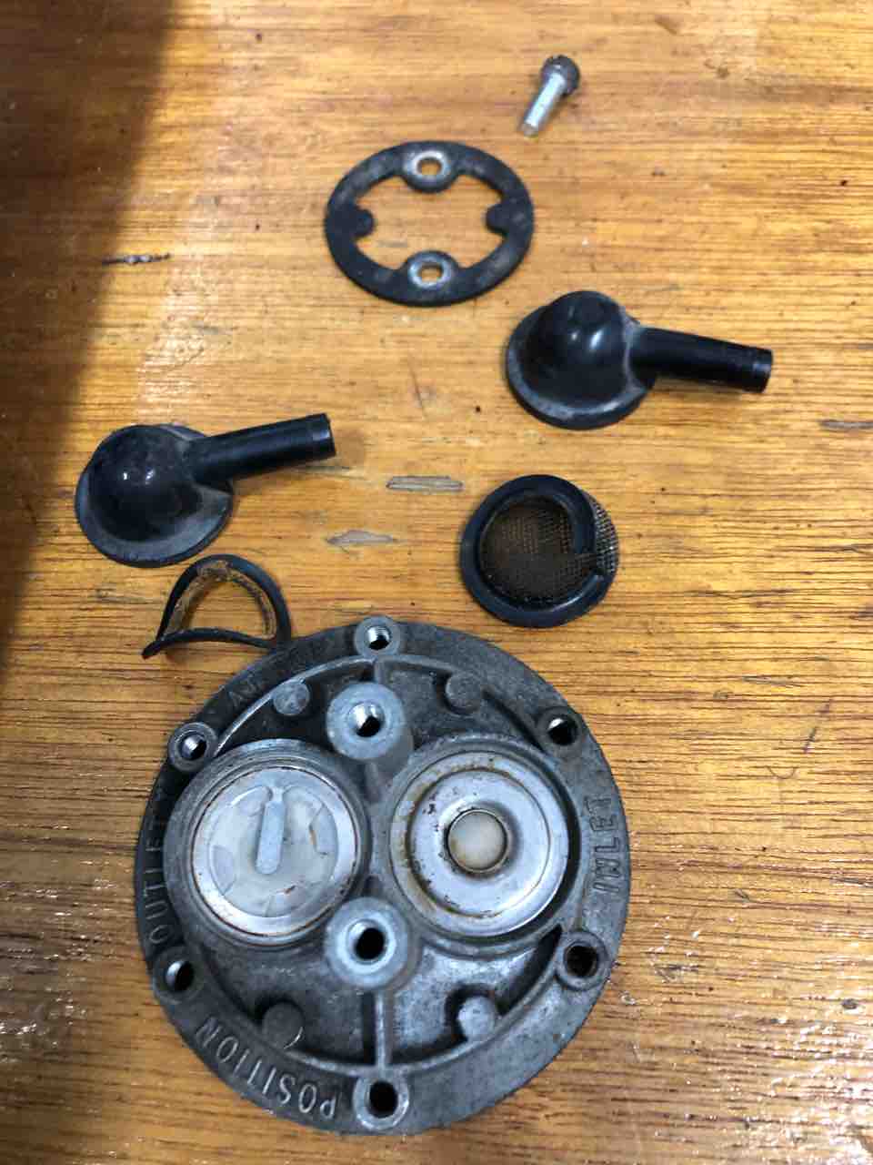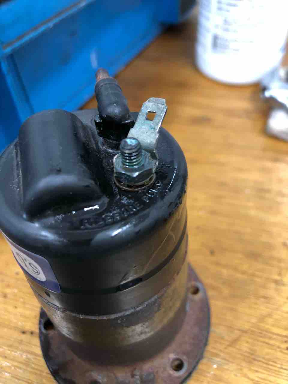2020年04月02日 SU製 燃料ポンプ 部品取り車についていた純正の燃料ポンプです。エンジンルームには別の社外ポンプが付いており、こちらは機能していませんでした。本体には黒いテープが巻かれています。こちらは12Vの端子このナットを緩めると電装川のカバーが外れます。導通を確認すると、開閉部の接点がまったくダメでした。清掃すると導通回復しまささた。ポンプ側はボルト二本でリングを外せば分解できます。異物を清掃し、ダイアフラムも綺麗にして仮組みしました。取り敢えずこの状態で12Vを供給するとカタカタ動いてくれました。そのうち燃料を漏れなく送れるか試験してみます。