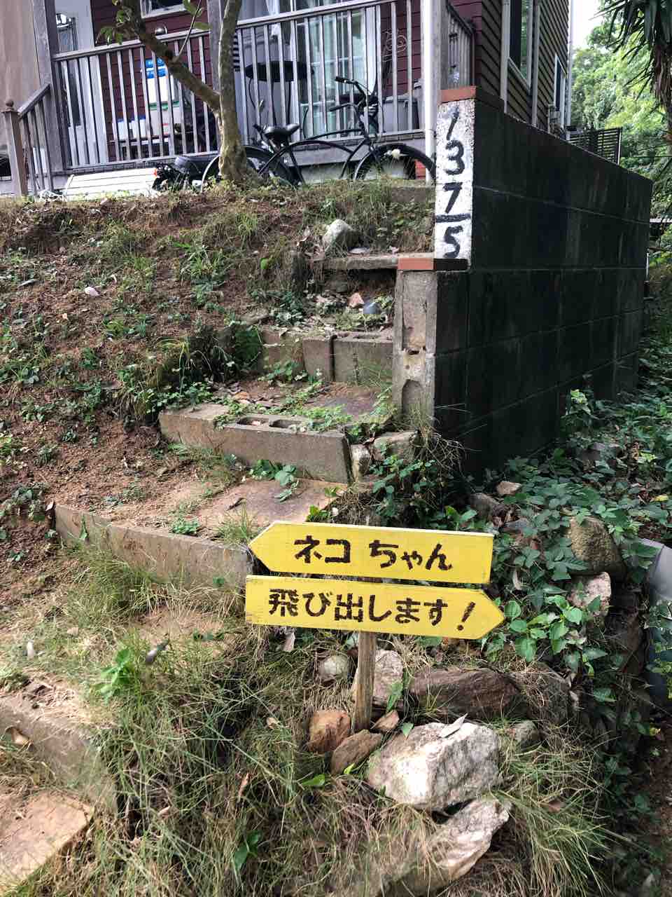 2020年08月23日 ネコ看板の立て直し ネコの看板が曲がっていたので真っ直ぐに直そうとしたら先端が折れてしまいました。木を取り替えるか先端を尖らせようかともおもいましたが、横着して石組みに挿しておきました。