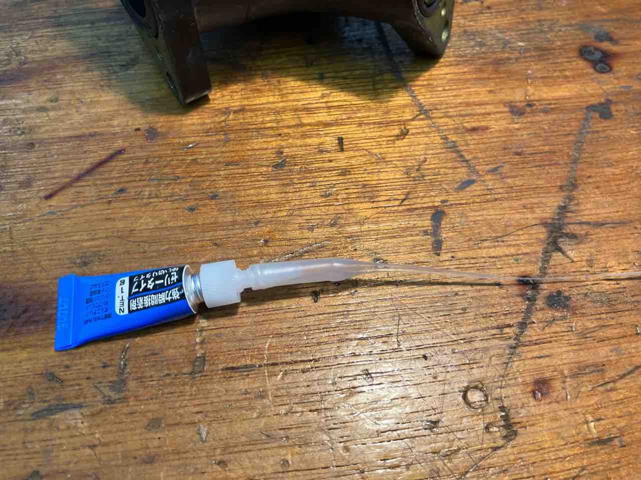 100均の瞬間接着剤に、こんな細いノズル付きがあったので、遊び半分に応急処置。