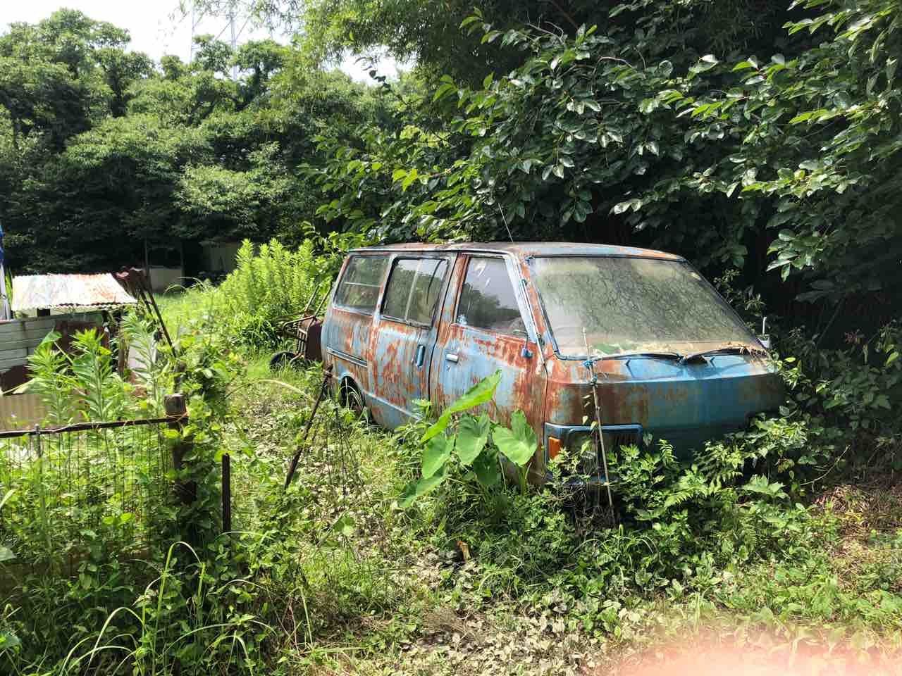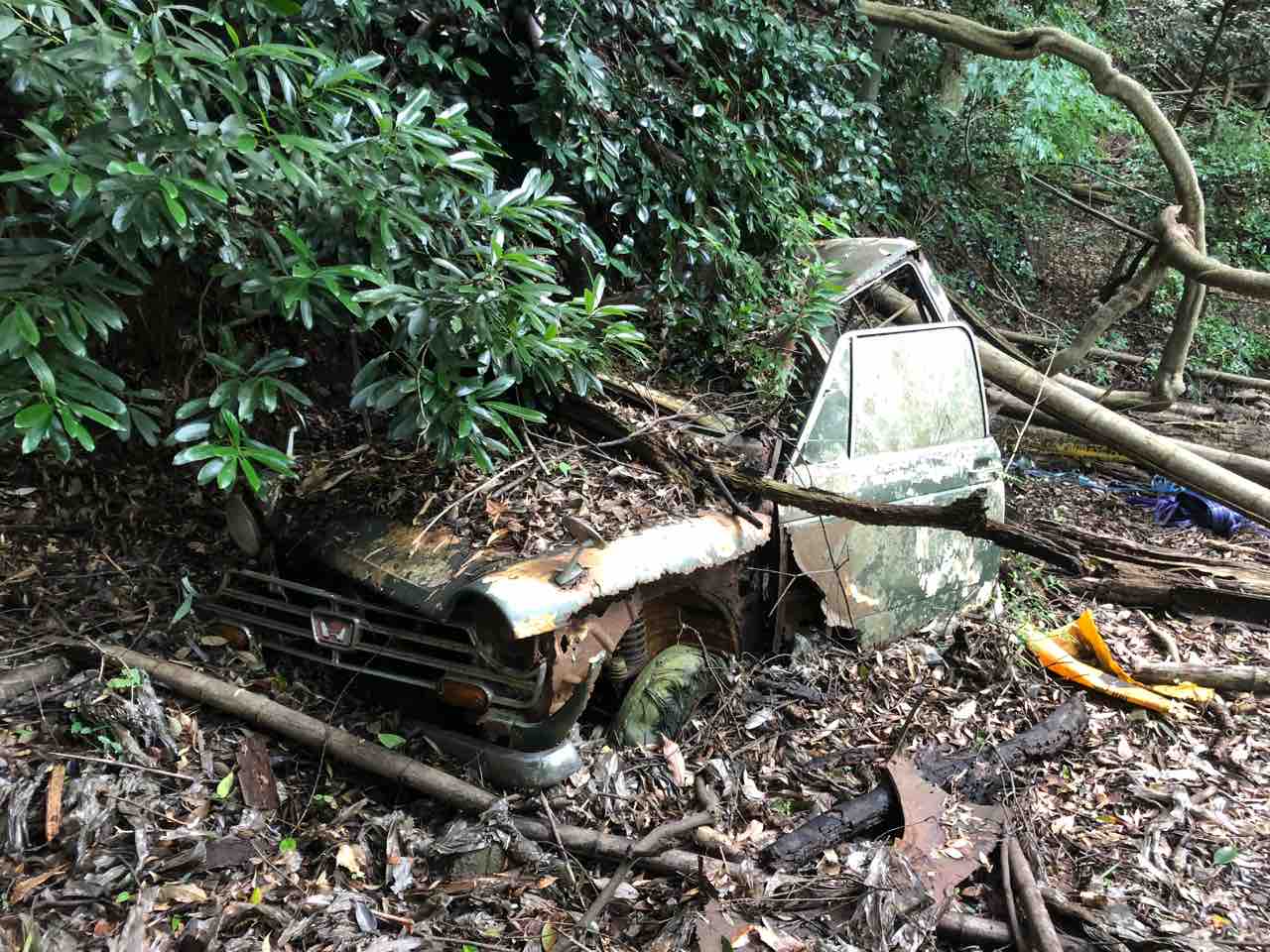 2022年07月27日 LN360 豊川市の1970年代に無人化した廃集落の目印になっている?Nバンです。NⅡのやつ、1969年位のですね。家か畑があったと思われる平らな土地の隅に眠っています。年式と廃村時期を照らすと、結構新し目の状態で放置されたのでしょうか?それとも後になって廃車を物置き代わりにしたか?ボディーはご覧のとおりですが、グリルが光っていました。この先もこの集落跡を見守ってゆくのでしょう。